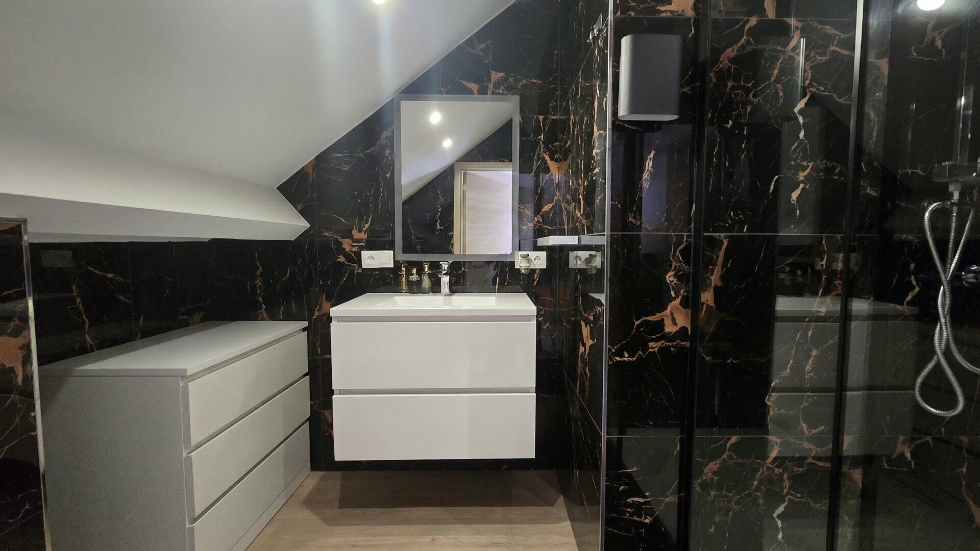 The house features four bedrooms. Built-in wardrobes provide practical storage space. In addition, there are two bathrooms, one of which is located on the upper floor and features a stylish marble finish and a spacious walk-in shower.