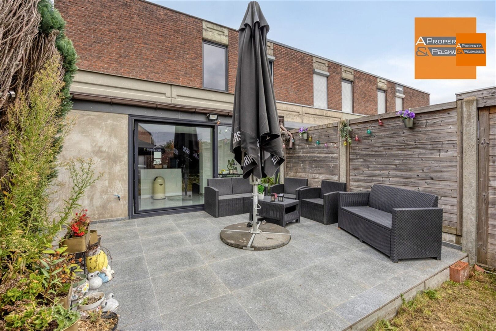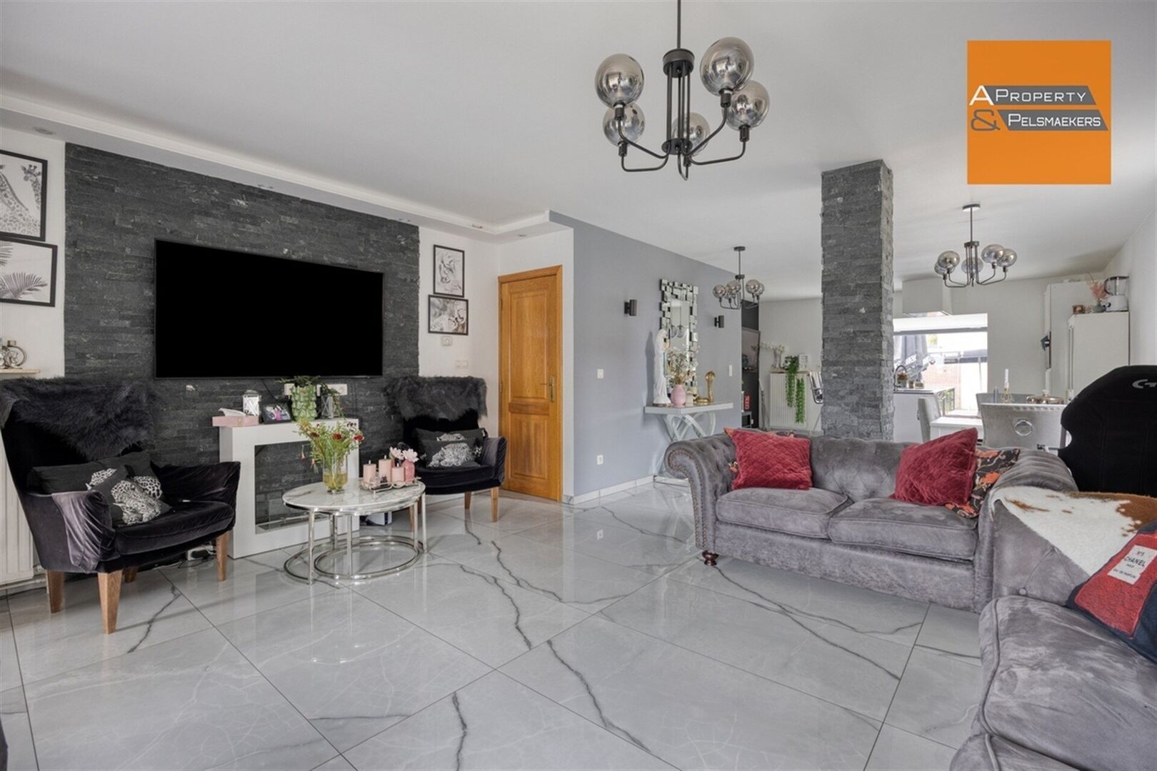 Along a pleasant front garden, we enter through the entrance hall with checkroom. The living space is open and divided into a living room of +/- 20m² and the kitchen with dining area.