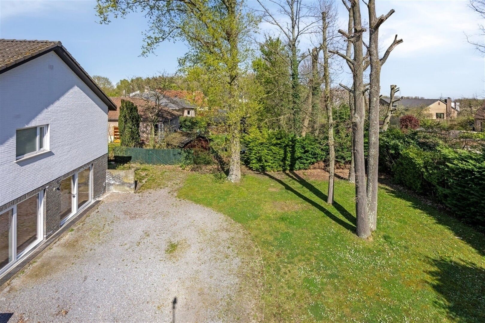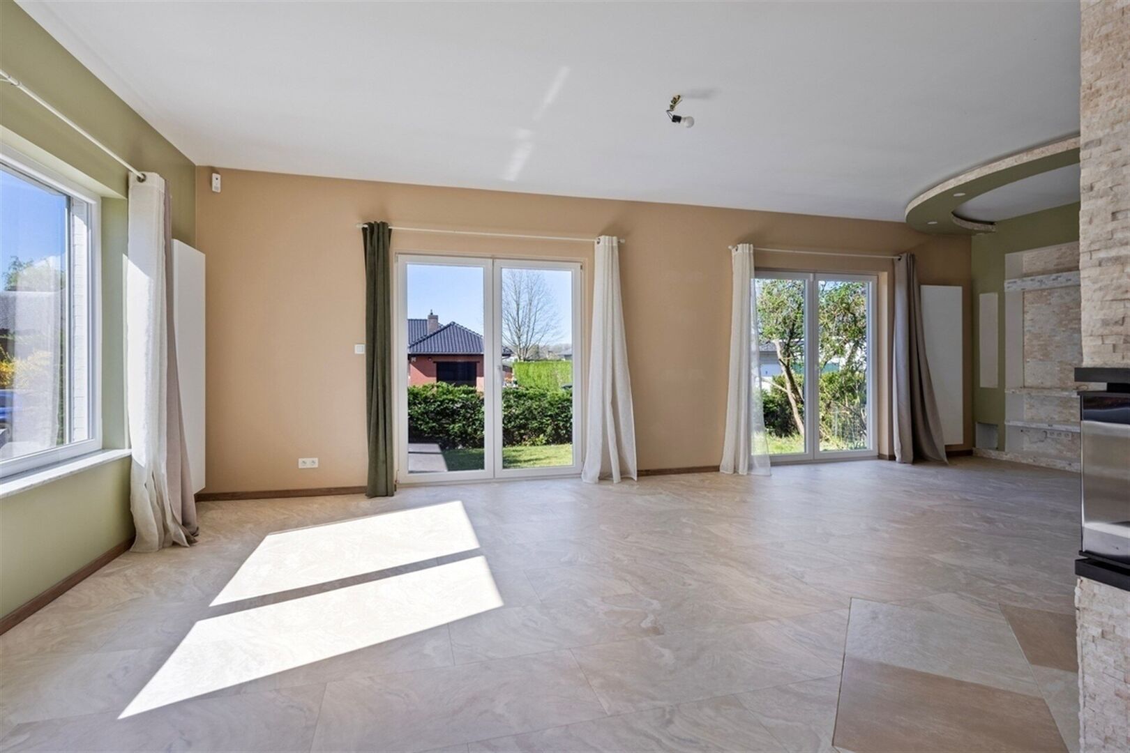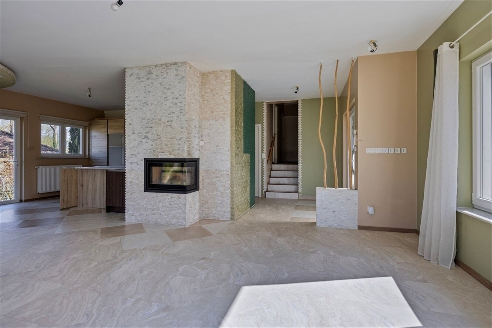 The lay-out consists of an open entrance hall with guest toilet, a bright and spacious living room ( +/- 50m²) with large windows giving access to the front garden. The built-in fireplace creates a cosy atmosphere and you have the possibility of adding a (second) kitchen. The night area offers 4 bedrooms (14, 11.5, 10.4 and 8.75 m²) with partly fitted wardrobes and the modern bathroom with spacious walk-in shower, toilet and washbasin.