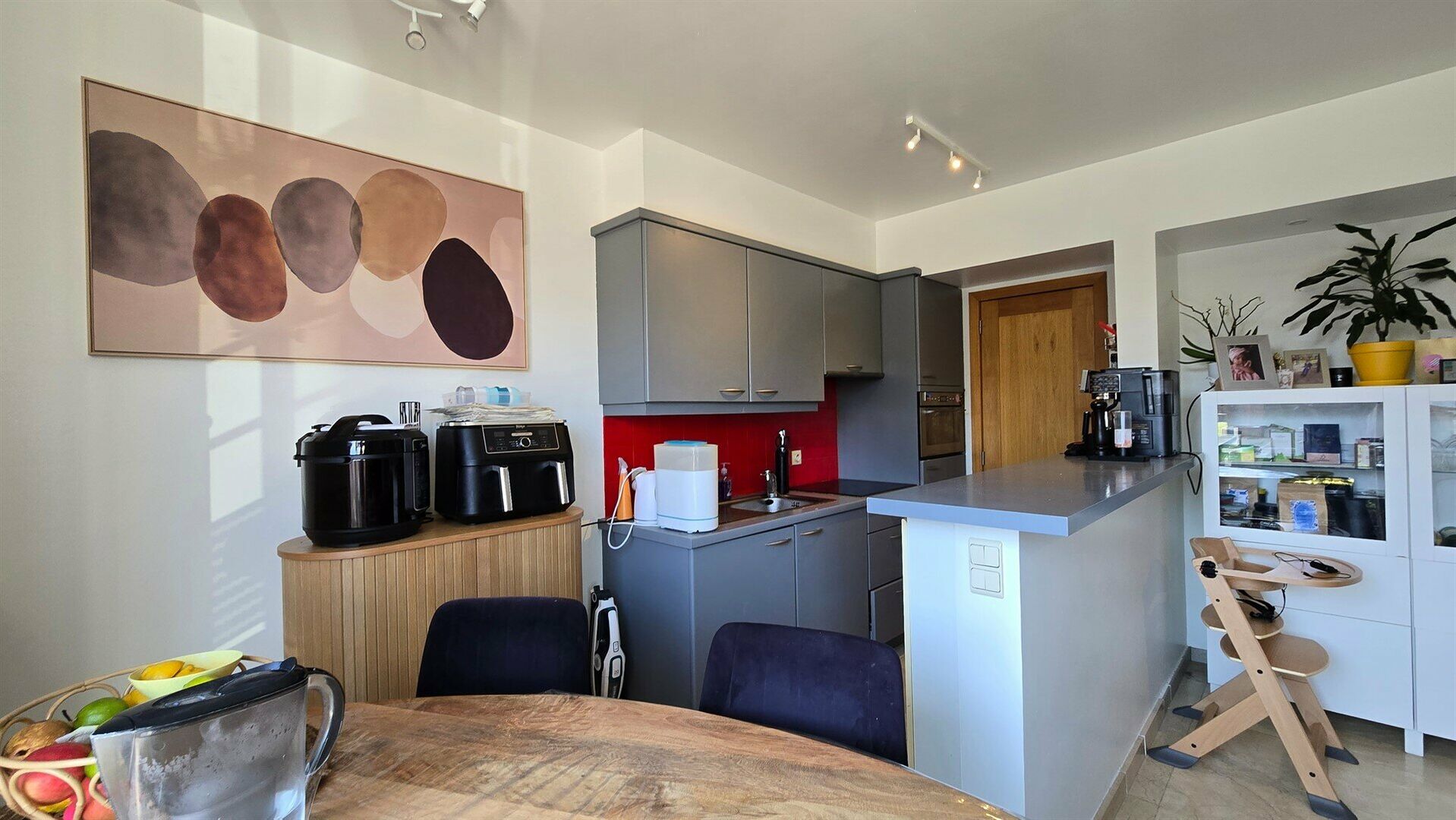 En entrant, vous arrivez dans un séjour lumineux qui donne accès à une agréable terrasse grâce à une grande baie vitrée coulissante. La cuisine se situe à côté du séjour et dispose également d’un espace de rangement pratique.