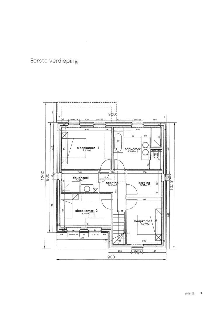 Ci-joint les plans d'un exemple de maison avec un grand hall d'entrée, un espace de vie spacieux de 46 m² avec une cuisine à l'ancienne, un bureau, un débarras, et à l'étage, 3 chambres, une salle de douche et une salle de bain et un débarras/ dressing. Sous le toit un grenier de +/- 40 m². Spécifications de base Verelst ;