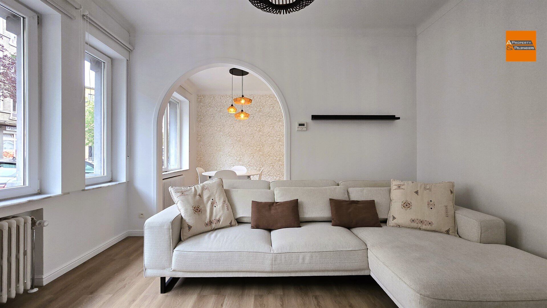 Un vaste séjour avec de grandes fenêtres laisse entrer une abondante lumière naturelle, créant une atmosphère agréable. Une ouverture en arc mène à la salle à manger attenante, offrant ainsi une disposition ouverte et conviviale.