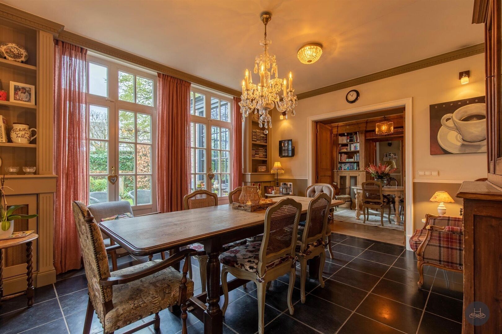 Aménagement: hall d'entrée, toilettes séparées, bibliothèque centrale, salon avec poêle à bois, spacieux bureau avec bibliothèque intégrée, salle à manger attenante à la cuisine entièrement équipée et prolongée d'une orangerie aménagée en salle à manger, buanderie avec placards intégrés, espace bureau, local technique et garage de stockage.