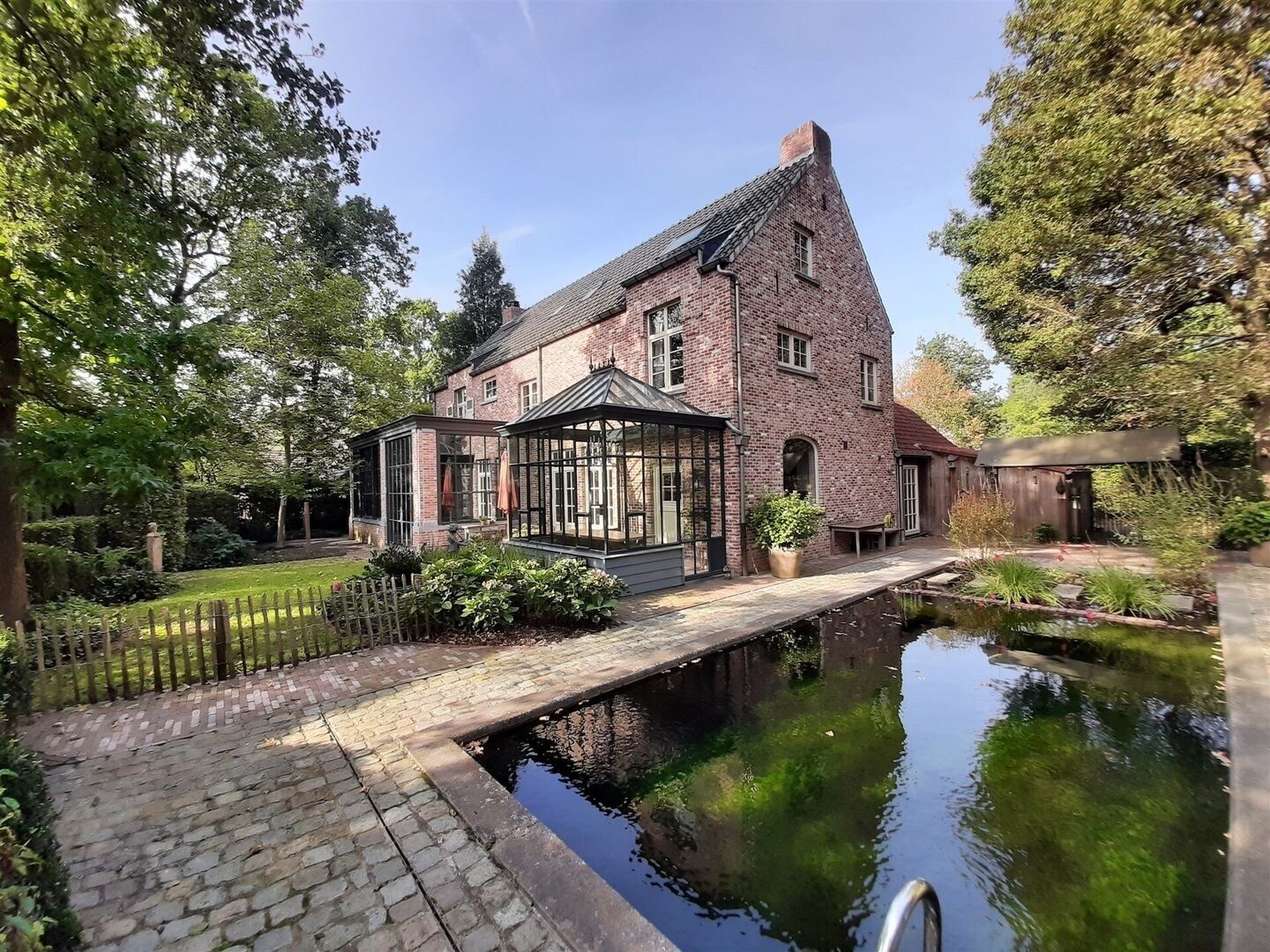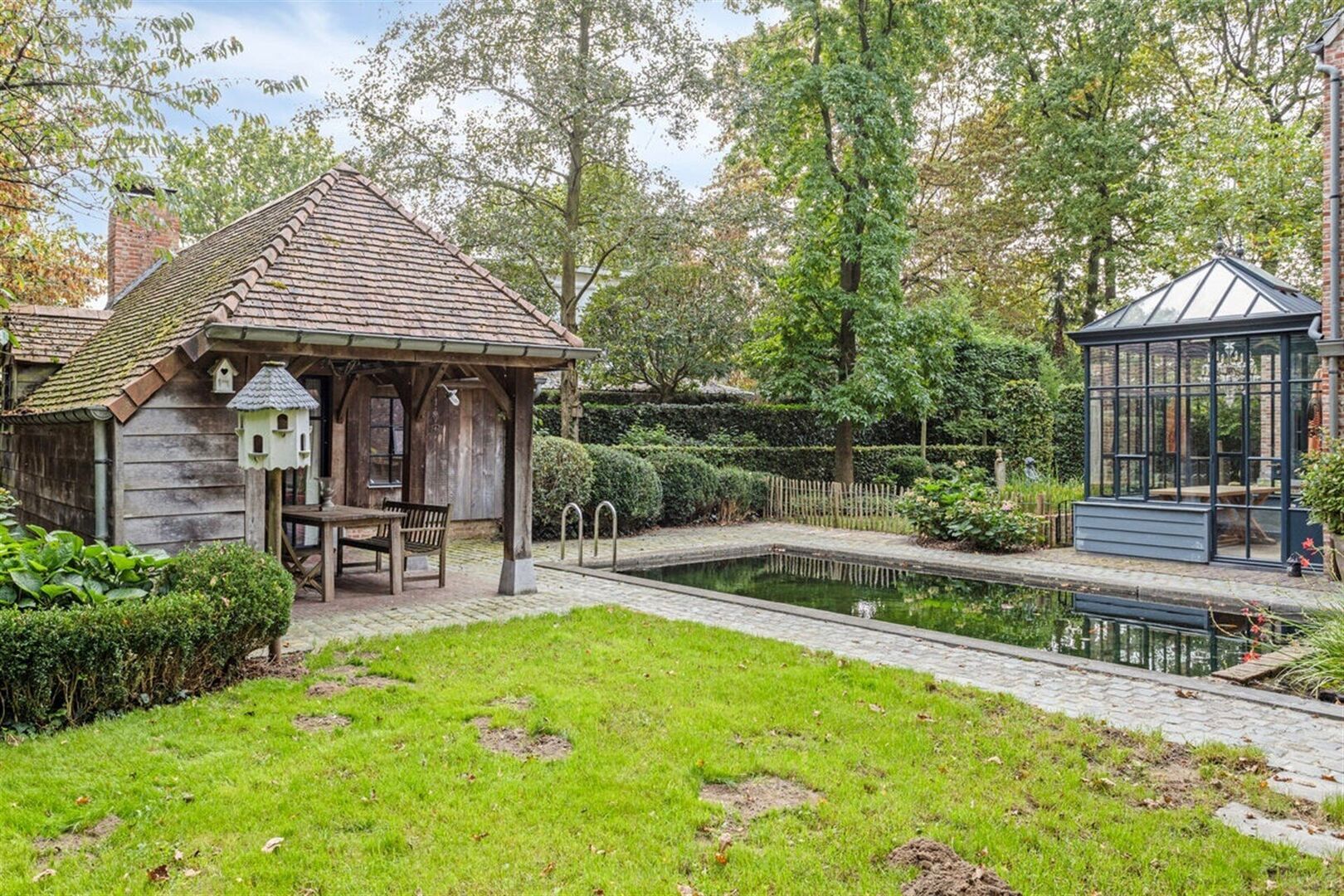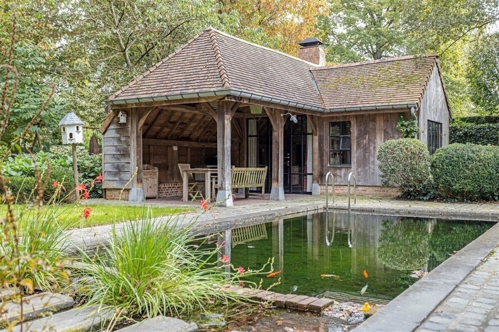 Extras : piscine à filtration naturelle, superbe poolhouse en chêne avec feu ouvert - double carport.