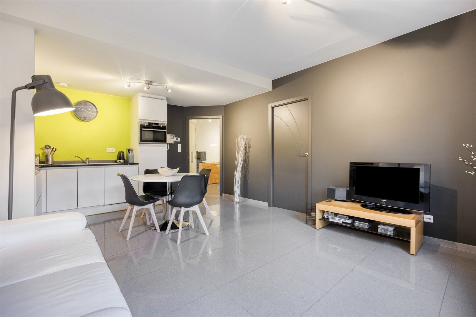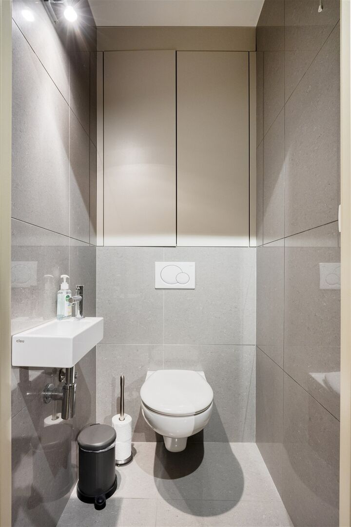 Het gelijkvloerse appartement is compact maar bijzonder praktisch ingedeeld, met een aangename lichtinval en moderne afwerking. Bij het binnenkomen is er een inkomhal met apart toilet, een badkamer met douche en lavabo, en een handige berging met aansluiting voor wasmachine. De leefruimte met open keuken vormt het hart van de woning en biedt een gezellig en functioneel geheel. Aansluitend bevindt zich de aparte slaapkamer, die voldoende ruimte en rust biedt.