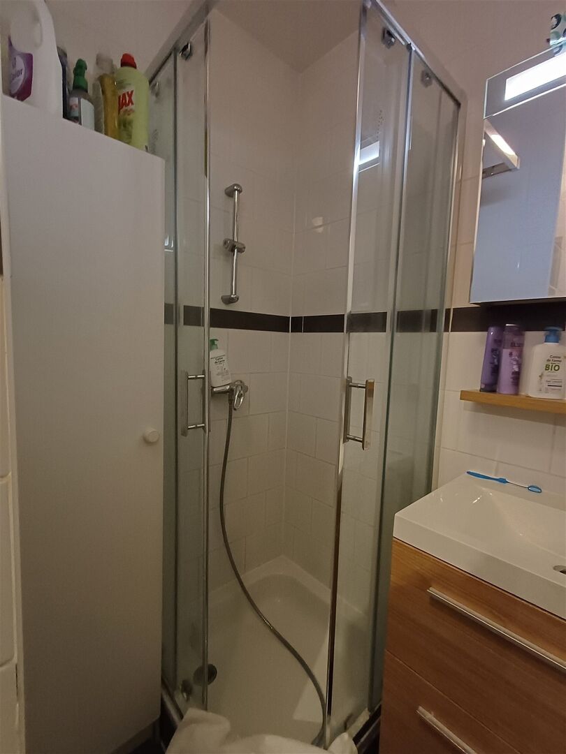 De slaapkamer, grenzend aan de leefruimte, biedt voldoende ruimte voor een tweepersoonsbed en kasten. De badkamer is mooi afgewerkt en uitgerust met een moderne douche, wastafel en toilet.