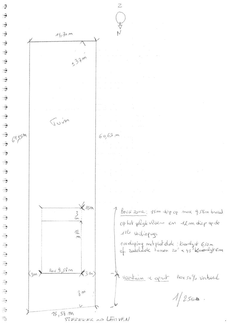 Maximale bouwdiepte is 15m op de begane grond en 12m op de verdieping ofwel 13m en 13 m, bouwvrije strook van 3m langs de weerzijde hebben (aan rechterzijde 3m afstand tot de weg naar de achtergelegen percelen). Het totale bebouwbare volume zal afhangen van het project(te bevestigen met de gemeente). De toegestane hoogte onder de kroonlijst is 6 m (zadeldak tussen 20° en 45°) of 7 m (plat dak). De voortuin mag voor maximaal 50% worden verhard. Maximaal 40% verharding tov. 60% groen op het perceel. Volgende algemene richtlijnen zijn van toepassing: