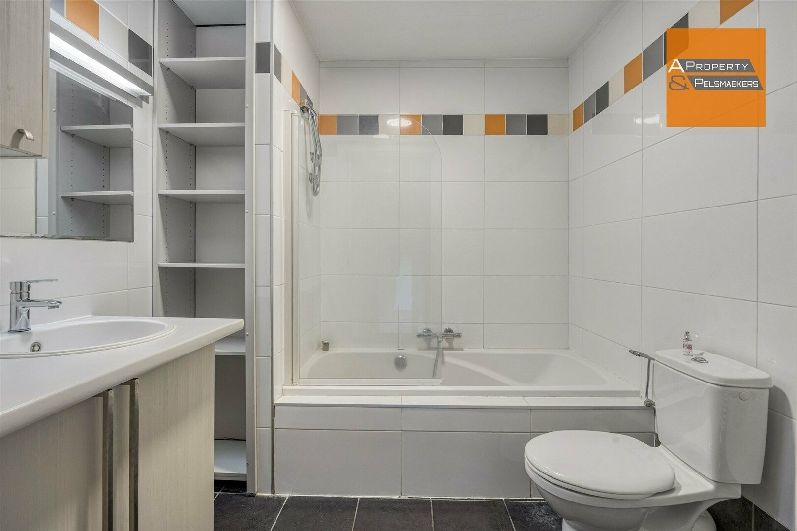 Badkamer met badkamermeubel, bad/douche en toilet