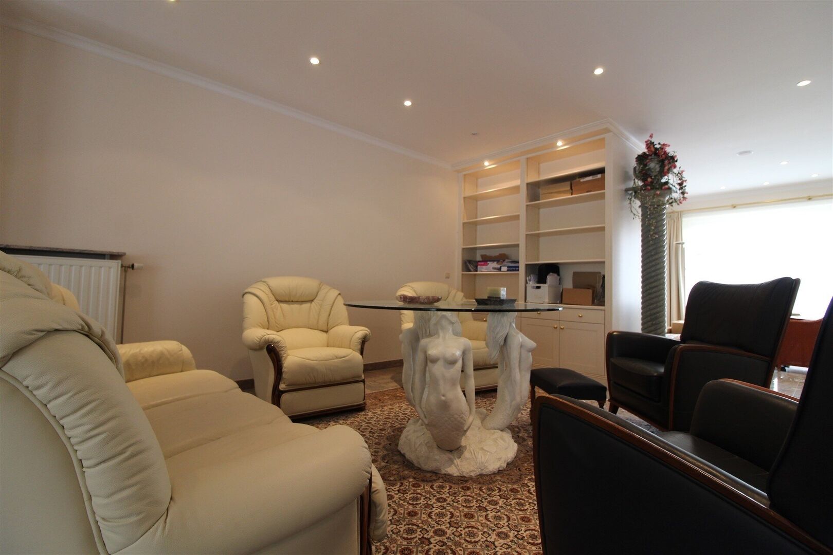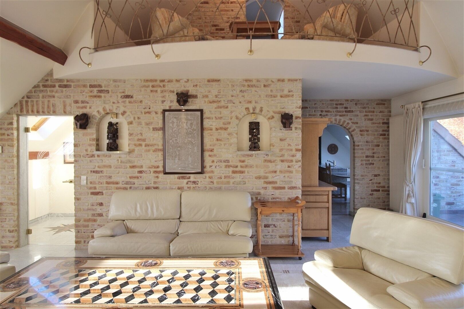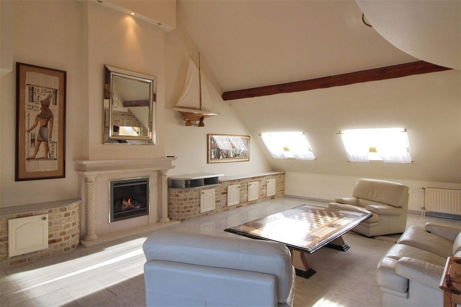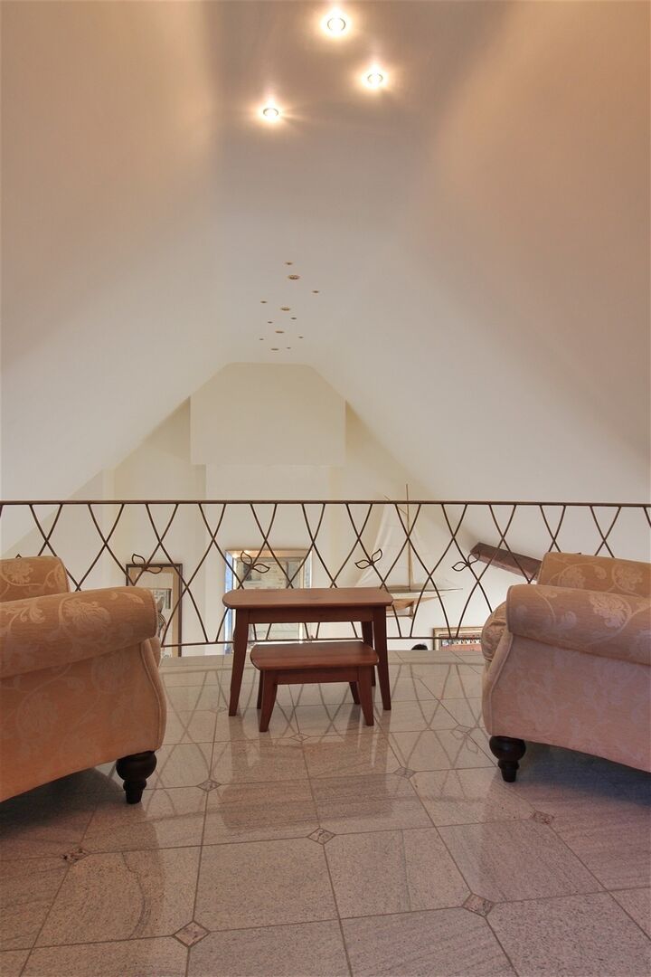 -Appartement van +/-203 m²: inkom met apart toilet en lavabo, gezellige en ruime zithoek met ingebouwde gashaard, eetruimte, bureauruimte, zeer ruime en super ingerichte keuken met eettafel, grote slaapkamer met ingebouwde kasten en ensuite badkamer (+/- 16m²) met jacuzzi bad, douche, toilet en dubbele lavabo, + ruim terras van 42 m².