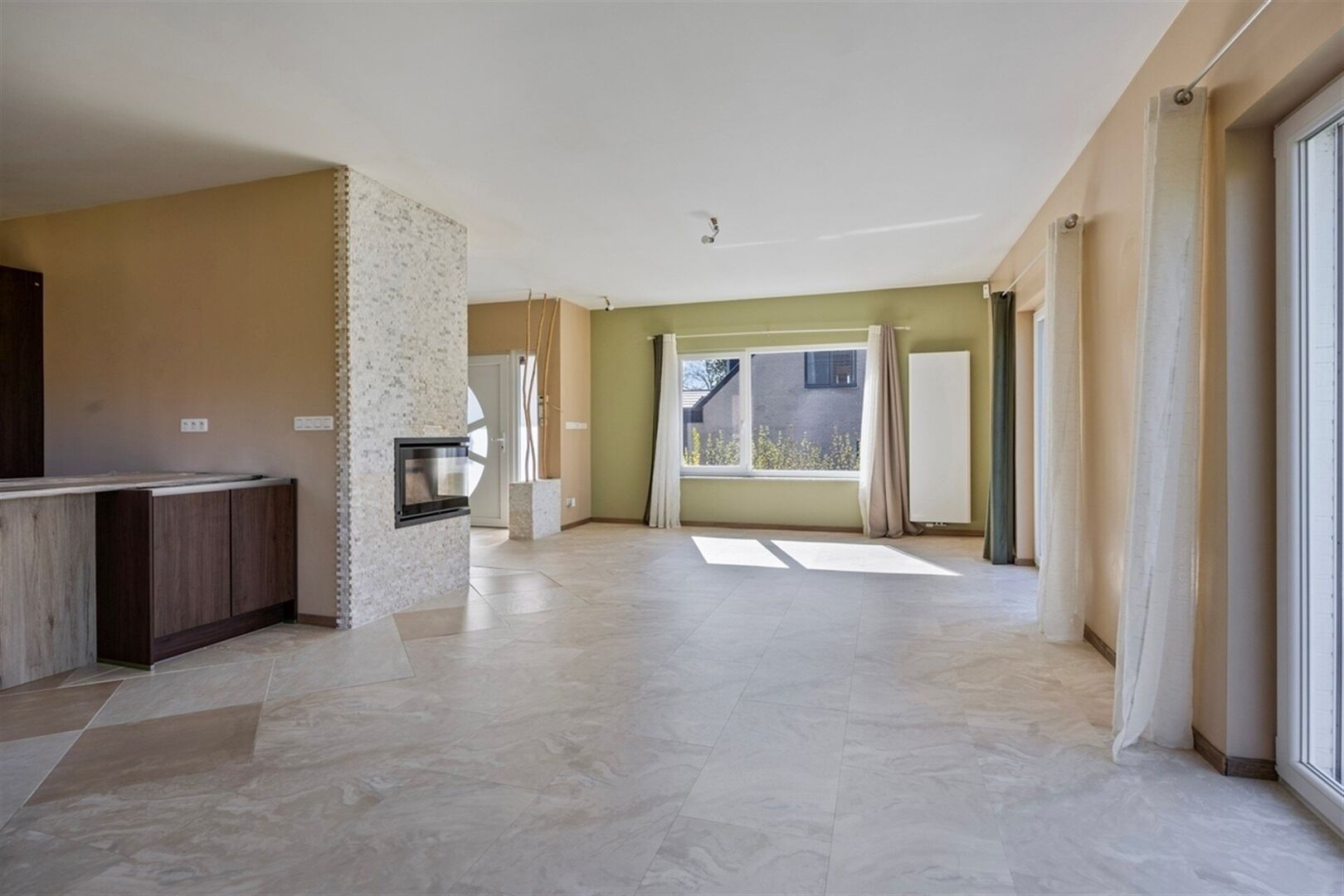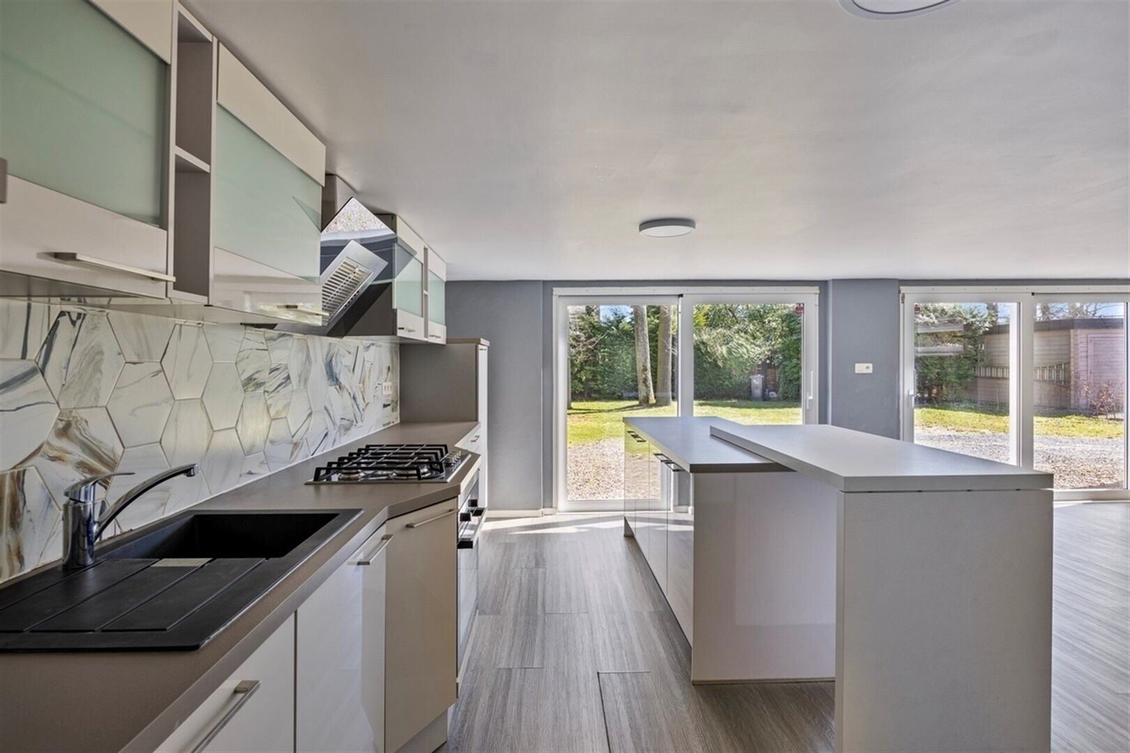 Op tuin niveau is de nieuwe leefkeuken (+/- 45 m²) voorzien van een grote eiland een droom voor iedere hobbykok. Met zijn functionele lay-out is het de plaats voor gasten te ontvangen. De tuin is toegankelijk via twee grote schuiframen.