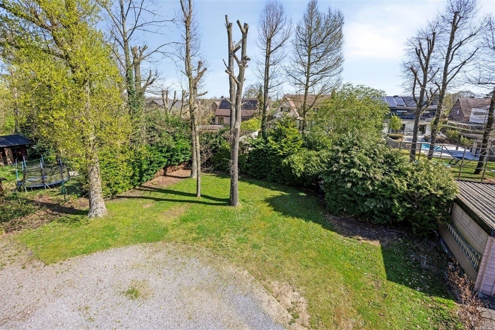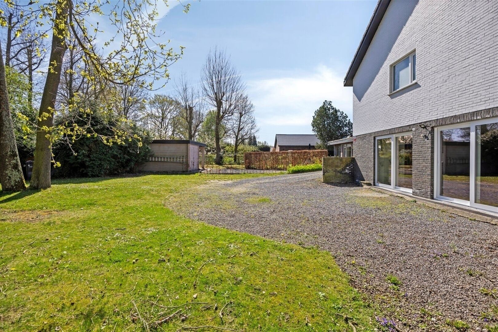 Buiten vindt u een ruime tuin met bomen die privacy en rust biedt, ideaal voor tuinfeesten of om gewoonweg te genieten van de frisse lucht. De lange oprijlaan biedt parkeergelegenheid voor meerdere voertuigen.